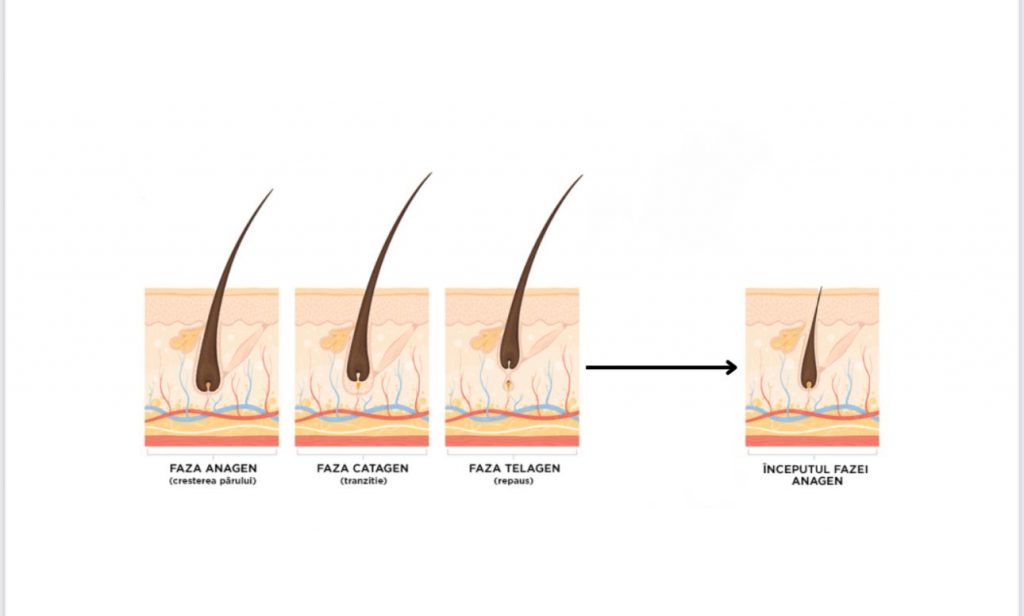 • Telogen – faza de repaus – unde firul de păr se “odihnește”, nu crește dar nici nu cade, iar în folicul începe formarea unui nou fir de păr.